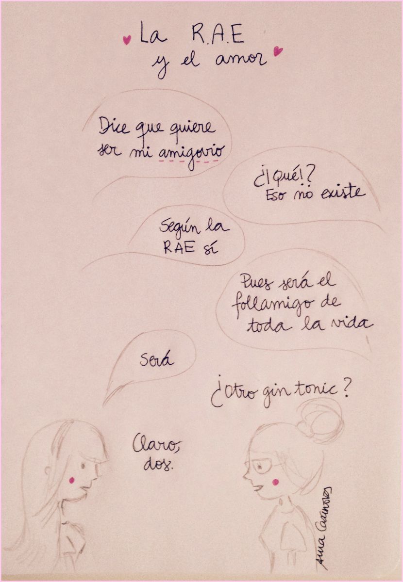 El pasado mes de octubre se publicó la vigésimo tercera edición del Diccionario de la RAE (en principio la última que se publicará en papel, según han anunciado) y en ella aparecen por primera vez palabras como tuit, wifi, papichulo, walkman y amigovio. Por mi trabajo (y pasión) es evidente que me interesa saber qué está tramando la RAE, además de quitar y poner acentos para volvernos a todos locos, así que cuando se publicó el nuevo diccionario intenté informarme sobre las novedades más significativas. Y cuando vi amigovio me quedé ojiplática (palabra no reconocida por la RAE, por cierto).